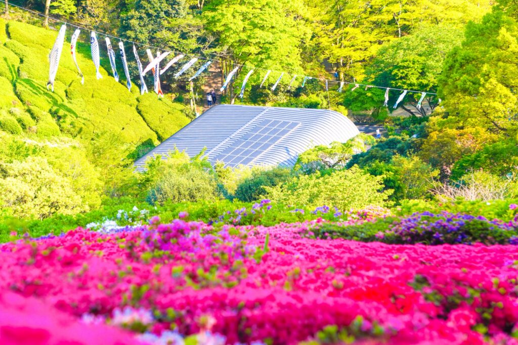 見頃のつつじに合わせて、園内各所にはたくさんのこいのぼりが掲げられます。